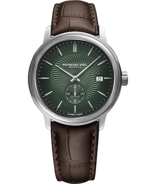 The maestro automatic timepiece is an homage of RAYMOND WEIL’s passion for music and virtuosity. Housed in a 39.5mm stainless steel case, this timepiece is enriched with several subtle details. At the heart of the watch, a Swiss self-winding movement delivers metronomic precision, ticking perfectly in time with an elegant daily life.The green dial is slightly smoky in appearance, transitioning from mid green at the centre of the dial to deep green near the perimeter. The central part of the dial encompasses a bewitching swirled pattern, while the hour track is adorned with a snailed motif. A minute track, located near the perimeter of the dial, is marked with crisp strokes, aiding readability. The crown is fluted with RAYMOND WEIL’s signature, the RW monogram. Slender silver-toned hour and minute hands are located centre stage, collaborating with matching indexes. An aperture adjacent the crown reveals the prevailing date, while a small seconds display, incorporating snailed detail, is positioned at 6 o’clock.To the rear of the watch, a sapphire crystal affords sight of the Swiss self-winding movement, the RW4250, with a power reserve of 38 hours. This maestro is presented on a brown calf leather strap, incorporating an alligator motif, paired with a stainless-steel folding clasp with double push-security system. water resistance upto 50 meters.