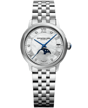 RAYMOND WEIL presents a new, feminine version of its iconic maestro collection: a reorchestration with an automatic movement radiating poetry and elegance.Made with the Swiss precision for which the company is renowned, this self-winding mechanical timepiece has a moon phase indicator at 6 o’clock and 38-hour power reserve. Housed in a 34mm stainless steel case, the white mother-of-pearl dial is soberly dressed with elegant Roman numerals, diamonds and a discreet date window at 3 o’clock, further adorned with contrasting royal blue hands composing a contemporary ode to the beauty and grace of time.The purity of mother-of-pearl and the delicate moon phase complication create the perfect harmony between elegance, sophistication, and innovation.Curated in several variations, the maestro ladies’ timepieces symbolising the unwavering bond between RAYMOND WEIL’s passion for watchmaking and its love of precision. water resistance upto 50 meters.