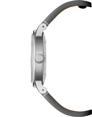 RAYMOND WEIL pays homage to the rich heritage and traditions of horology while celebrating the simplicity of refined design. The brand has naturally delved into the past, creating new timepieces that offer period charm combined with present-day practicality. The silver dial, located beneath a vintage-inspired sapphire crystal glass-box, has been refined to the highest degree. The hours and minutes are eloquently conveyed with silver-toned hands, lined with Super-LumiNova®. The sector dial presents the hours, minutes and seconds periods on discrete tracks, augmenting readability. A closer inspection of the dial reveals contrasting finishes, the hour track is smooth, the minute track is snailed and the central area of the dial is adorned with a delicate vertical brush. The bezel is decorated with a vertical satin-brush that contrasts wonderfully with the highly polished bevel nearby. This juxtaposition of two finishes reinforces the overall level of finishing. A sapphire caseback affords sight of the self-winding movement within and the “W-shaped” oscillating weight, RAYMOND WEIL’s horological signature. The grey genuine calf leather strap is enhanced with a unique W-stitched detail. Reference 2125 combines a contemporary sensibility with a neovintage aesthetic. This central seconds comes in 3 very distinctive dial colors – silver, denim blue and burgundy – with geometric lines and a sector dial. As the name suggests, the collection is a grand vintage interpretation of the RAYMOND WEIL brand.