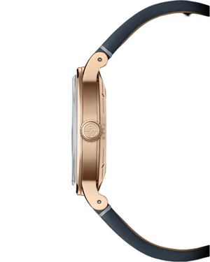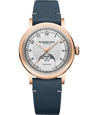 The 35mm millesime moon phase marks a fresh take on this iconic horological function: with its visually striking, sectorized dial, this model offers a reading of the lunar phases that is both dynamic and intuitive. The implementation of the moon phase, an emblematic watchmaking function, heralds a new face of creative elegance for RAYMOND WEIL. The silver dial, located beneath a vintage-inspired sapphire crystal glass-box, has been refined to the highest degree. The hours and minutes are eloquently conveyed with silver-toned hands, lined with Super-LumiNova®. The sector dial presents the hours, minutes and seconds periods on discrete tracks, augmenting readability. A closer inspection of the dial reveals contrasting finishes, the hour track is smooth, the minute track is snailed and the central area of the dial is adorned with a delicate vertical brush. This timepiece features Super-Luminova® Arabic numeral indexes and a 6 o’clock aperture displaying the moon phase, specifically designed for the collection, embracing graphic and classic horological codes. The unique moon design, inspired by traditional horology with a modern twist, showcases a smiling face accompanied by planets and stars, conveying a clear and positive message to the wearer. The bezel is decorated with a vertical satin-brush that contrasts wonderfully with the highly polished bevel nearby. This juxtaposition of two finishes reinforces the overall level of finishing. A sapphire caseback affords sight of the self-winding movement within and the “W-shaped” oscillating weight, RAYMOND WEIL’s horological signature. The navy blue genuine calf leather strap is enhanced with a unique W-stitched detail. As the name suggests, the collection is a grand vintage interpretation of the RAYMOND WEIL brand.