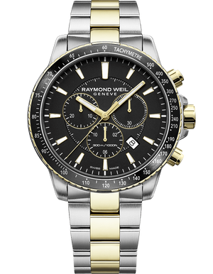 Raymond Weil Tango silver-tone stainless steel case with a two-tone (silver-tone and yellow gold PVD) stainless steel bracelet. Fixed yellow gold PVD bezel with a black top ring. Black dial with gold-tone hands and index hour markers. Minute markers around the outer rim. Date display between the 4 and 5 o'clock positions. Quartz movement. Scratch resistant sapphire crystal. Screw down crown. Solid case back. Round case shape. Case size: 43 mm. Case thickness: 11.9 mm. Band width: 22 mm. Fold over clasp with a push button release. Water resistant at 300 meters.