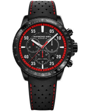 This tango quartz chronograph features a 43mm stainless steel case with black PVD coating and an anodized black aluminum tachymeter bezel. The sleek black dial is complemented by Arabic numerals and indexes, three black subdials, red inner bezel and second hand, as well as date window between 4 and 5 o’clock. The stainless steel tango chronograph is equipped with a Swiss quartz movement and a black genuine rubber strap with a double push-security system, proving to be the perfect timepiece for any occasion, courtesy of its 300 m water resistance.The tango collection embodies the passion that RAYMOND WEIL, the Swiss watchmaker, puts into achieving timepieces of both aesthetic sensuality of design and rhythmic perfection. With its refined and modern design, this contemporary collection appeals to both men and women. Functionality marries with sensual design, making this a watch worn to suit any occasion.