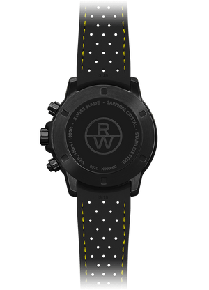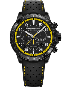 The tango quartz chronograph features a 43mm stainless steel case with black PVD coating and an anodized black aluminum tachymeter bezel. The sleek black dial is complemented by Arabic numerals and indexes, three black subdials, yellow inner bezel and second hand, as well as date window between 4 and 5 o’clock. This tango chronograph is equipped with a Swiss quartz movement and a black genuine rubber strap with a double push-security system, proving to be the perfect timepiece for any occasion, courtesy of its 300 m water resistance.The tango collection embodies the passion that RAYMOND WEIL, the Swiss watchmaker, puts into achieving timepieces of both aesthetic sensuality of design and rhythmic perfection. With its refined and modern design, this contemporary collection appeals to both men and women. Functionality marries with sensual design, making this a watch worn to suit any occasion.