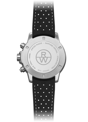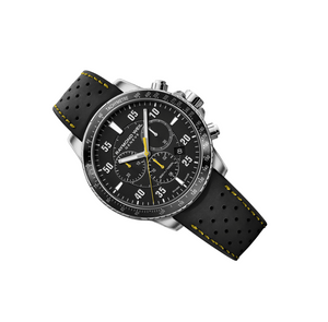 The tango quartz chronograph features a 43mm stainless steel case and an anodized black aluminum tachymeter bezel. The sleek black dial is complemented by Arabic numerals and indexes, three black subdials, a yellow second hand and date window between 4 and 5 o’clock.This tango chronograph is equipped with a Swiss quartz movement and a black genuine rubber strap with a double push-security system, proving to be the perfect timepiece for any occasion, courtesy of its 300 m water resistance.The tango collection embodies the passion that RAYMOND WEIL puts into achieving timepieces of both aesthetic sensuality of design and rhythmic perfection. Functionality marries with sensual design, making this a watch worn to suit any occasion.