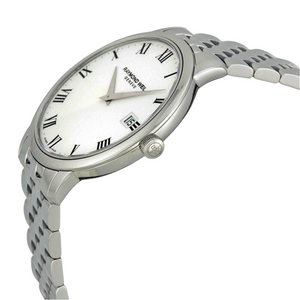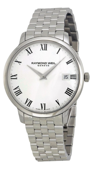 Raymond Weil Toccata White Dial Steel Bracelet Men's 42 mm Watch 5588-ST-00300. Stainless steel case with a stainless steel bracelet. Fixed stainless steel bezel. White dial with silver-tone hands and Roman numeral hour markers. Minute markers around the outer rim. Dial Type: Analog. Date display at the 3 o'clock position. Quartz movement. Scratch resistant sapphire crystal. Case diameter: 42 mm. Case thickness: 7.82 mm. Round case shape. Deployment clasp. Water resistant at 50 meters / 165 feet. Functions: date, hour, minute. Dress watch style. Watch label: Swiss Made.