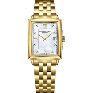 A popular style in the art deco era of the 1920s and 1930s, square-faced watches are making a chic new revival. RAYMOND WEIL introduces this design in the form of our ever-classic and popular ladies’ toccata collection.This new quartz model adopts a sophisticated art deco appeal with an elongated rectangular face and slim 6.25 mm case. This is our shallowest case design to date which gives a very sleek profile to this watch.This timepiece of choice is available in several variations. The face comes in combinations of black roman numerals on a crisp white dial or alternating gold & diamond indexes on a mother-of-pearl face.The sapphire crystal window is framed by a beveled rectangular case. The tiered design gives this watch an illusion of depth without the thickness. The watch is completed with RW monogram signature upon the crown.Unlike the classic round ladies’ toccata, this watch manages to nail a refined, retro aesthetic all the while remaining true to the Swiss craftsmanship and inspiration behind the collection. Water resistant up to 50 meters
