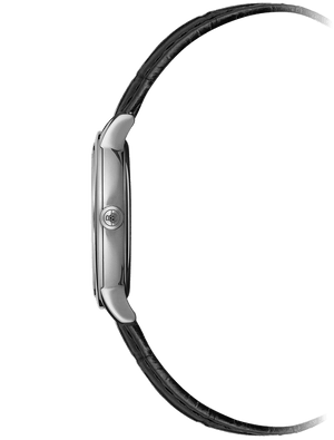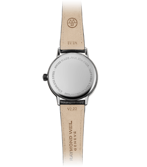 Equipped with a quartz movement, this toccata ladies’ watch features a stainless steel 29 mm case and a date window at 3 o’clock. The silver lacquered and sunray satin-finished dial is set with applied Roman numeral indexes and has a railway-track chapter ring that aids readability. To complement this modern classic, alligator motifs have been added on the strap. Refined design and timeless materials: the toccata collection celebrates the artistic and musical spirit behind the Brand’s DNA. Following in the footsteps of the great composers, toccata promotes the Swiss horology of RAYMOND WEIL while respecting the tradition and heritage handed down from generation to generation within the family company.The watch has got a resistancy up to 50 metres.