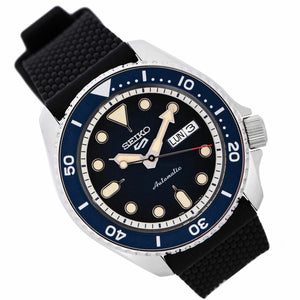 Silver-tone stainless steel case with black silicone strap. Uni-directional rotating blue stainless steel bezel. Blue dial with silver-tone hands and index hour markers. Minute markers around the outer rim. Dial Type: Analog. Luminescent hands and markers. Date display at the 3 o'clock position. Automatic movement. Round case shape. Case size: 42.5 mm. Band width: 22 mm. Buckle clasp. Water resistance up to 100 meters / 330 feet. Functions: date, day, hour, minute, second. Sport watch style. Watch label: Japan Movt. Seiko 5 sports automatic blue dial men's Watch SRPD71K2.
