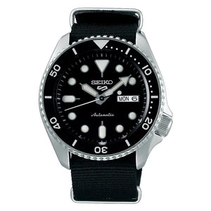 Silver-tone stainless steel case with a black nylon strap. Uni-directional rotating black stainless steel bezel. Black dial with black hands and index hour markers. Minute markers around the outer rim. Dial Type: Analog. Luminescent hands and markers. Date display at the 3 o'clock position. Automatic movement. Screw down crown. Round case shape. Case size: 42.5 mm. Band width: 22 mm. Water resistant at 100 meters / 330 feet. Functions: date, day, hour, minute, second. Sport watch style. Watch label: Japan Movt. Seiko 5 Sports Automatic Black Dial Mens Watch SRPD55K3.