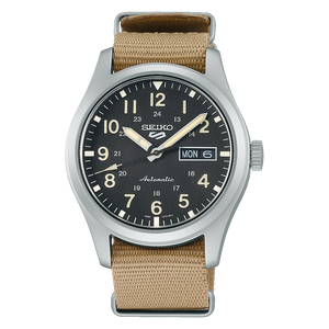 Seiko 5 sports automatic mens watch SRPG35K1. Stainless steel case with a khaki nylon strap, and black dial. Automatic movement with manual winding. Case thickness: 13.2 mm, case diameter: 39.4 mm, case length: 48.1 mm. Water resistance up to 100 meters / 10 bar. Duration approx. 41 hours. Curved hardlex crystal. Lumibrite on hands and index(es). Screw case back. See-through case back. 24 jewels, day/date display, stop second-hand function.