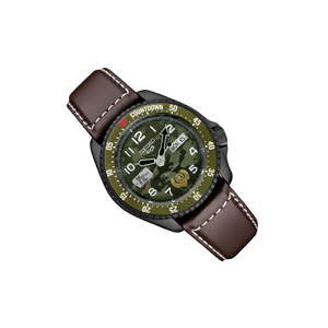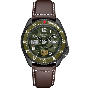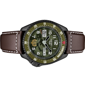 Seiko 5 sports street fighter v limited edition Guile. Stainless steel case with black ion finish. Brown leather strap, khaki green dial. Khaki green one-way rotating elapsed timing bezel. Case diameter: 42.5mm. Water resistance upto 100 meters (330 feet). Hardlex crystal. Automatic movement with manual winding capacity. 21,600 vibrations per hour. Power reserve: approximately 41 hours. Day/date calendar, 24 jewels. Screwdown see-through caseback