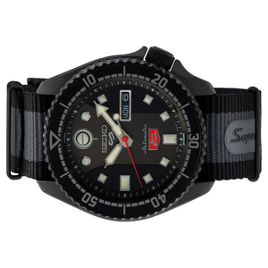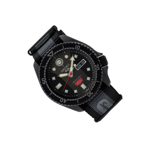 Seiko 5 sports Super CUB - limited edition automatic men's watch SRPJ75K1F. Stainless steel hard coating case with grey/black nylon strap, and black dial. Case size 42.5mm. Water resistance up to 100 meters. Automatic movement. Hardlex crystal. Buckle clasp.