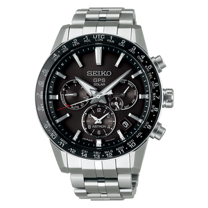 Seiko astron gps solar mens watch SSH003J1. Titanium with ceramic case with a Titanium bracelet, black dial. Case size 42.9 mm. Water resistance upto 100 meters. GPS Solar movement. Sapphire crystal. Three-fold clasp with push button release.