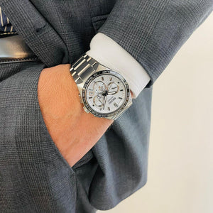 Seiko astron GPS solar mens watch SSH117J1. Titanium super hard coating case and bracelet with white dial. Solar Movement. Case size 43.1mm. Water resistance up to 100 meters. Scratch resistant sapphire crystal. Three fold clasp with push button release.