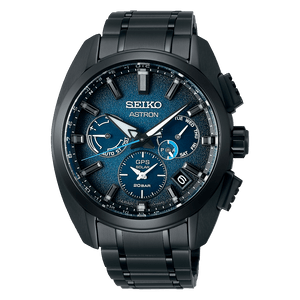 Seiko astron limited edition gps solar mens watch SSH105J1. Titanium (super-hard coating) case with a Titanium bracelet, blue dial. Case size 42.8 mm. Water resistance upto 200 meters. GPS Solar movement. Dual-curved sapphire crystal. Three-fold clasp with push button release.