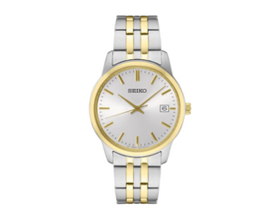 From the Essentials Collection. Offering classic designs, the Essentials Collection provides the ideal solution for all-day wear. Crafted of stainless steel in versatile two-tone finish, this perfectly tailored watch features a contemporary minimalist white dial with gold hands and markers, as well as a date calendar, for a superb blend of clarity and style. 5 bar, 50M Water Resistant. Quartz movement. Case size 40mm. Hardlex crystal. Three-fold clasp with push button release.