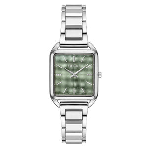 Seiko essentials quartz womens watch SWR075. Stainless steel case and bracelet with green dial. Quartz movement. Hardlex crystal. Three fold clasp with push button release. Square case shape. Case size 26mm. Water resistance up to 50 meters.