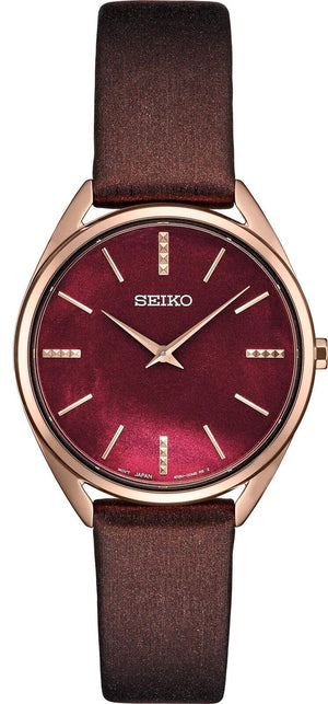 Seiko essentials quartz womens watch SWR082. Slim stainless steel case with rose gold finish. Burgundy satin finish faux leather strap. Bordeaux mother-of-pearl dial, textured rose gold markers. Quartz movement. Hardlex crystal. Pin buckle clasp. Round case shape. Case size 32mm. Water resistance up to 50 meters.