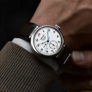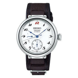 Seiko presage 110th anniversary limited edition automatic mens Watch SPB359J1. Stainless steel case with brown leather strap, white dial. Automatic movement. Case size 37.5mm. Water resistance up to 50 meters. Box shaped sapphire crystal. Pin buckle clasp.