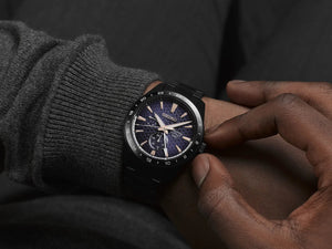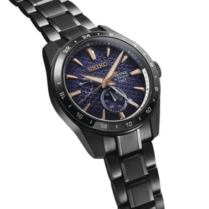 Presage akebono sharp edged GMT limited edition automatic mens watch SPB361J1. Stainless steel black super hard coating case and bracelet with sapphire blue gradation dial. Automatic movement. Case size 42.2mm. Water resistance up to 100 meters. Sapphire crystal. Three fold clasp with push button release.