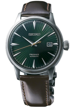 Seiko mens watch. Silver stainless-steel case and brown Leather strap. Green dial. Automatic movement. Three-fold clasp with push button release. Case thickness: 11.8 mm, Case diameter: 40.5 mm, Case Length: 47.5 mm. Water resistance of 50 meters.