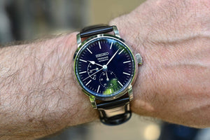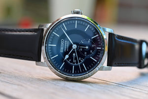 Seiko presage automatic enamel dial men's watch SPB163J1. Stainless steel case with a brown horse skin strap, blue dial. Automatic movement with manual winding. Dual-curved sapphire crystal, anti-reflective coating on inner surface. Deployment clasp with push button release. Water resistance upto 100m / 10 bar. Case thickness 12.4 mm, case diameter 39.9 mm, case length 47.2 mm. Enamel dial. This enamel dial was manufactured by firing at high temperature. By the melting process, there may be little dimples, tiny dots and rough surface on the dial. This is a unique feature of genuine enamel dial. Screw case back. See-through case back. Other Features: 29 jewels, date display, date hand, power reserve display, stop second hand function.