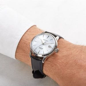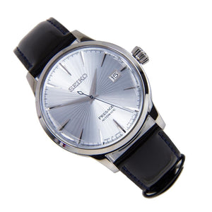 Seiko Presage Sky-Diving-Cocktail , featuring light grey/silver/ice blue sunburst dial, makes the watch to look anew at every different angle. The watch has spherical/ box-shaped hardlex crystal glass and see-thru caseback. Slightly bigger crown at 4mm to ease hand winding and time setting. Individually numbered on caseback. Case size 40.5 mm. Water resistance upto 50m.