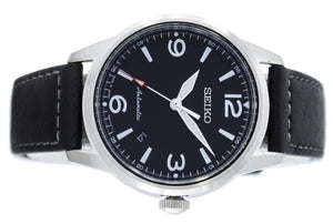 Seiko mens watch. Silver stainless-steel case Black dial. Automatic movement. Water resistance of 100 meters. Black Leather strap Stainless-steel case, Black dial. Case diameter: 41.6mm.