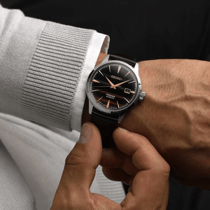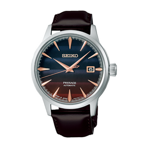 Seiko Presage automatic limited edition mens watch SRPK75J1 Star bar limited edition of 9,000 pieces. Stainless steel case with brown calif leather strap, multi-colored dial. Automatic movement. Water resistance up to 50 meters. Case size 40.5mm. Three-fold clasp with push button release. Features limited edition on the case back. Serial number engraved on the case back. Interchangeable band with quick release spring bars. See-through and Screw case back.