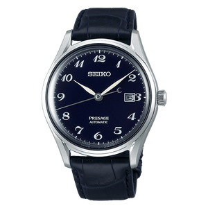 Seiko presage automatic mens watch SJE077J1. Stainless steel (super hard coating) case with a Crocodile leather strap, black dial. Case size 39.5 mm. Water splash resistant. Automatic movement. Box shaped sapphire crystal.