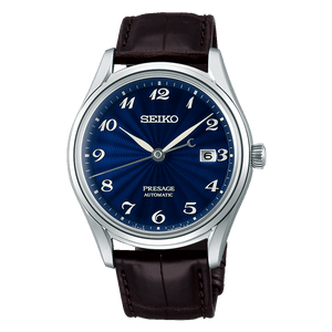 Seiko presage automatic mens watch SJE079J1. Stainless steel (super hard coating) case with a Crocodile leather strap, blue dial. Case size 39.5 mm. Water splash resistant. Automatic movement. Box shaped sapphire crystal. Three-fold clasp with push button release.