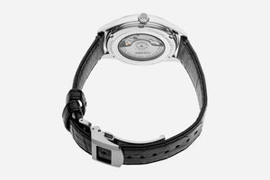 Seiko presage automatic mens watch SJE081J1. Stainless steel (super hard coating) case with a Crocodile leather strap, black dial. Case size 39.5 mm. Water splash resistant. Automatic movement. Box shaped sapphire crystal. Three-fold clasp with push button release.