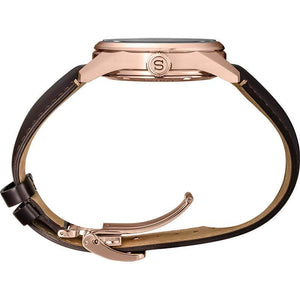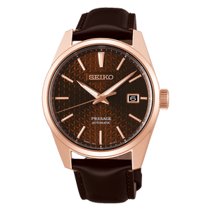 Seiko presage automatic men's watch SPB170J1. Rose gold stainless steel case with a brown horse skin strap, brown dial. Automatic movement with manual winding. Sapphire crystal, anti-reflective coating on inner surface. Lumibrite on hands and indexes. Deployment buckle clasp. Water resistance upto 100m / 10 bar. Case thickness 11.1 mm, case diameter 39.3 mm, case length 47.2 mm. Screw case back. See-through case back. Other Features: 24 jewels, date display, stop second hand function.