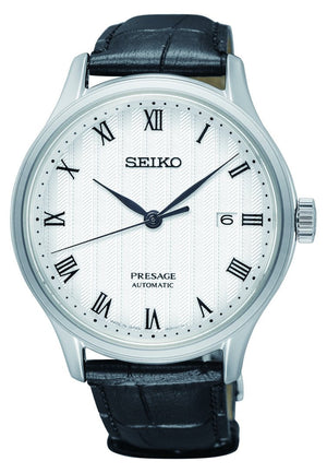 Seiko presage automatic men's watch SRPC83. Stainless steel case with a black leather strap, white dial. Automatic movement. Sapphire crystal. Three-fold clasp with push button release clasp. Round case shape. Case size 41.7 mm. Water resistant at 30 m.