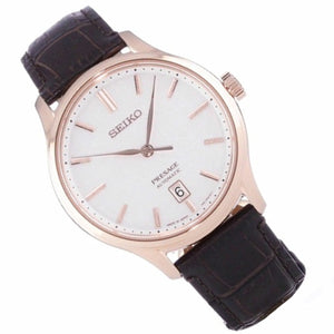 Seiko presage automatic men's watch SRPD42. Rose gold-plated case with a brown leather strap, white dial. Automatic movement. Sapphire crystal. Three-fold clasp with push button release clasp. Round case shape. Case size 41.7 mm. Water resistant at 30 m.