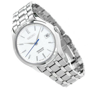 Seiko presage automatic men's watch SRPD97. Stainless steel case with a stainless steel bracelet, white dial. Automatic movement. Sapphire crystal. Three-fold clasp with push button release. Round case shape. Case size 38.3 mm. Water resistant at 30 m.