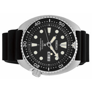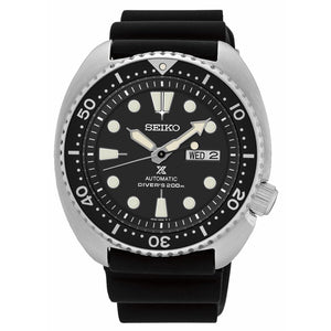Particularly impressive mens watch from Seiko, of the Prospex series with a black silicone strap, automatic mechanism, diving-water resistant at 200 meters. Stainless Steel case with black silicone strap, black dial. Automatic movement. Water resistant up to 200 meters. Case Size 44.3mm. Hardlex Crystal. Pin buckle clasp.