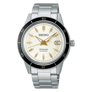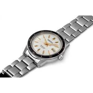 Seiko presage automatic mens watch SRPG03. Stainless steel case and bracelet, white dial. Case size 40.8 mm. Water resistance up to 50 meters. Automatic movement. Box-shaped Hardlex crystal. Three-Fold Clasp With Push Button Release.