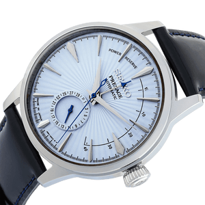 Seiko presage automatic mens watch SSA343J1. Stainless steel case with a black leather strap, silver dial. Automatic movement with manual winding. Case thickness: 14.4 mm, case diameter: 40.5 mm. Water resistance upto 50 meters / 5 bar. Duration approx. 41 hours. Box shaped hardlex. Three-fold clasp with push button release. 29 jewels, date hand, power reserve display. Stop second hand function.