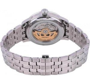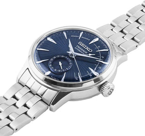 Seiko presage automatic mens watch SSA347. Stainless steel case and bracelet, blue dial. Case size 40.5 mm. Water resistance upto 50 meters. Automatic movement. Box shaped Hardlex crystal. Three-Fold Clasp With Push Button Release.