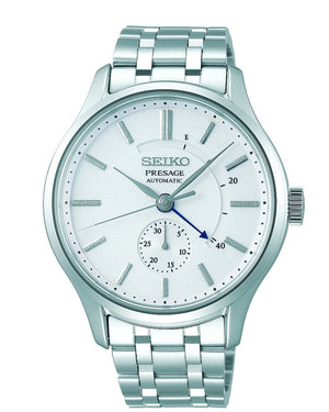 Seiko presage automatic men's watch SSA395. Stainless steel case with a stainless steel bracelet, white dial. Automatic movement. Sapphire crystal. Three-fold clasp with push button release. Round case shape. Case size 42 mm. Water resistant at 30 m.