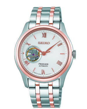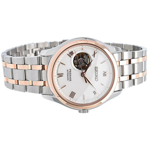 Seiko presage automatic men's watch SSA412. Two-tone stainless steel case with a two-tone stainless steel bracelet, white dial. Automatic movement. Dual curved sapphire crystal. Three-fold clasp with push button release. Round case shape. Case size 38.3 mm. Water resistant at 30 m.