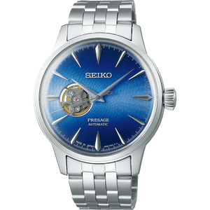 Seiko presage automatic mens watch SSA439. Stainless steel case and bracelet, blue dial. Case size 40.5 mm. Water resistance upto 50 meters. Automatic movement. Box shaped Hardlex crystal. Deployment Clasp With Push Button Release.