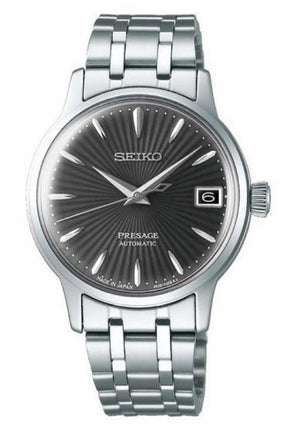 Seiko presage automatic women's watch SRP837. Stainless steel case with a stainless steel bracelet, black dial. Automatic movement. Box shaped Hardlex crystal. Three-fold clasp with push button release. Round case shape. Case size 33.8 mm. Water resistant at 50 m.