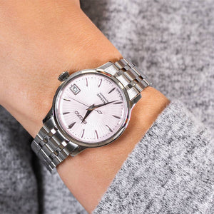 Seiko presage automatic women's watch SRP839. Stainless steel case with a stainless steel bracelet, pink dial. Automatic movement. Box shaped Hardlex crystal. Three-fold clasp with push button release. Round case shape. Case size 33.8 mm. Water resistant at 50 m.