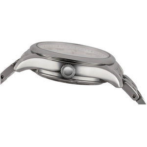Seiko presage automatic womens watch SRPF47. Stainless steel case and bracelet, white dial. Case size 34.3 mm. Water resistance upto 30 meters. Automatic movement. Dual curved sapphire crystal. Three-fold clasp with push button release.