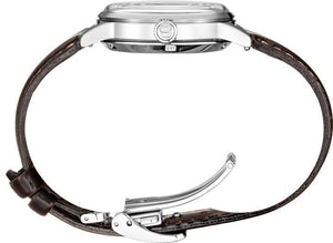 Seiko presage automatic women's watch SSA783. Stainless steel case with a brown leather strap, brown dial. Automatic movement. Box shaped Hardlex crystal. Three-fold clasp with push button release clasp. Round case shape. Case size 33.8 mm. Water resistant at 50 m.