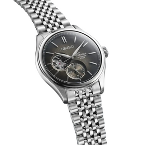 Seiko Presage classic series automatic mens watch SPB471J1. Stainless steel case and bracelet with black dial. Automatic movement. Water resistance up to 100 meters. Dual-curved sapphire crystal Anti-reflective coating on inner surface. Deployment clasp with push button release.