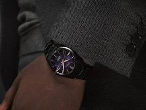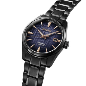 Seiko presage limited edition automatic mens watch SPB363J1. Stainless steel black super hard coating case and bracelet with sapphire blue gradation dial. Automatic movement. Case size 39.3mm. Water resistance up to 100 meters. Sapphire crystal. Three fold clasp with push button release.