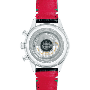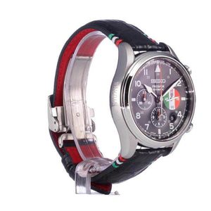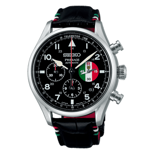 Seiko presage porco rosso limited edition automatic men's watch SRQ033J1. Stainless steel (super hard coating) case with a black crocodile leather strap, black dial. Automatic movement with manual winding. Dual-curved sapphire crystal, super-clear coating. Water resistance upto 100m / 10 bar. Case thickness 14.9 mm, case diameter 42 mm, case length 49.5 mm. Enamel dial. This enamel dial was manufactured by firing at high temperature. By the melting process, there may be little dimples, tiny dots and rough surface on the dial. This is a unique feature of genuine enamel dial. LIMITED EDITION on the case back. Screw case back. See-through case back. Serial number engraved on the case back. Other Features: 34 jewels, chronograph with 30 minutes & 12 hours, date display, stop second hand function.